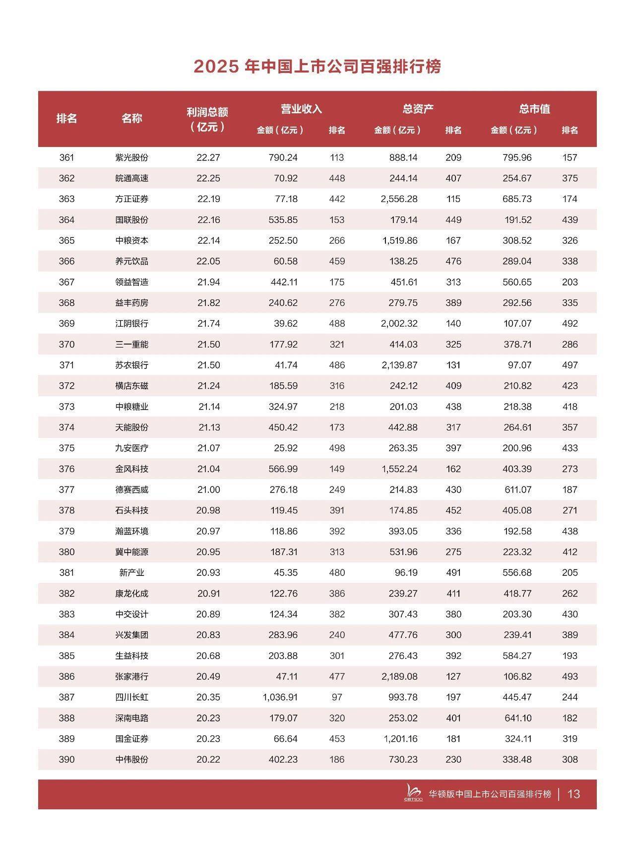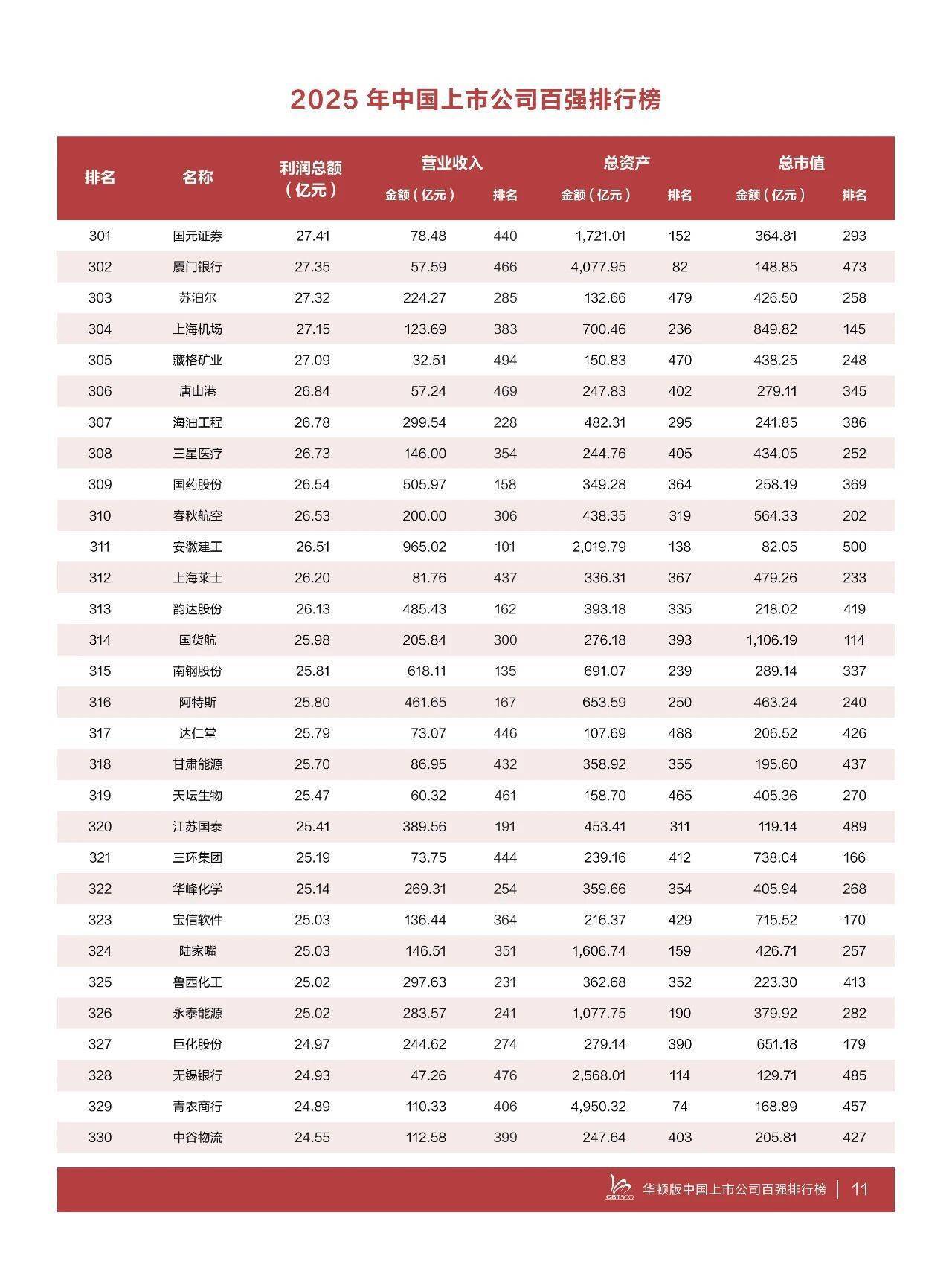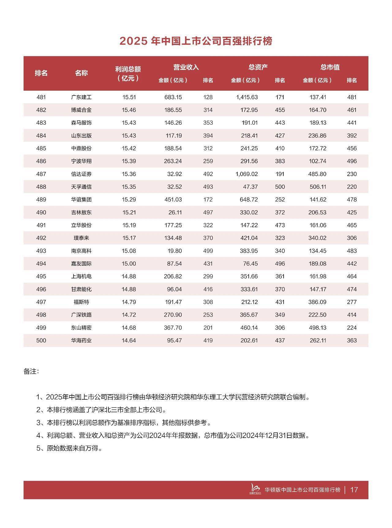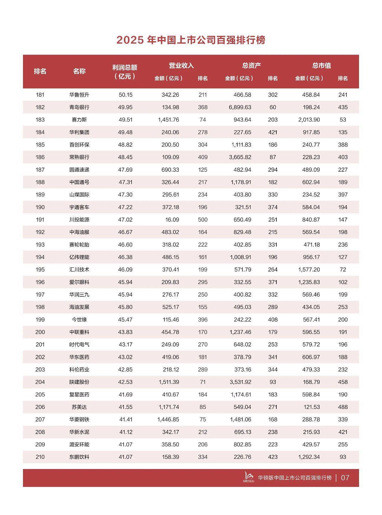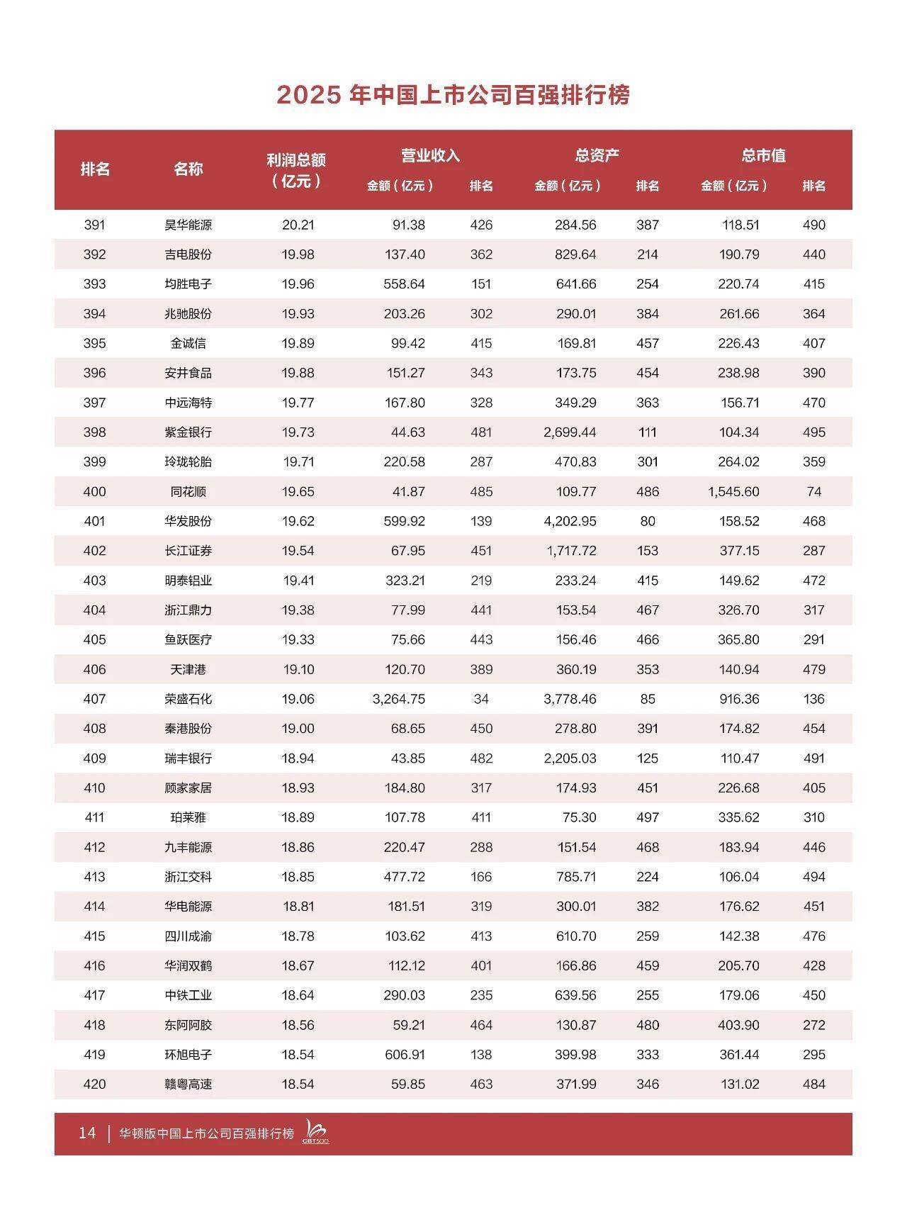 据介绍,“2025中国上市公司百强排行榜”中,利润超100亿元企业97家,较上年减少5家,超500亿元企业24家,较上年增加5家,超1000亿元企业12家,较上年增加2家。今年的上榜线(即第500名的利润额)为2024年度利润额14.64亿元,比上年的16.49亿元下降11.22%,华海药业居第500位。