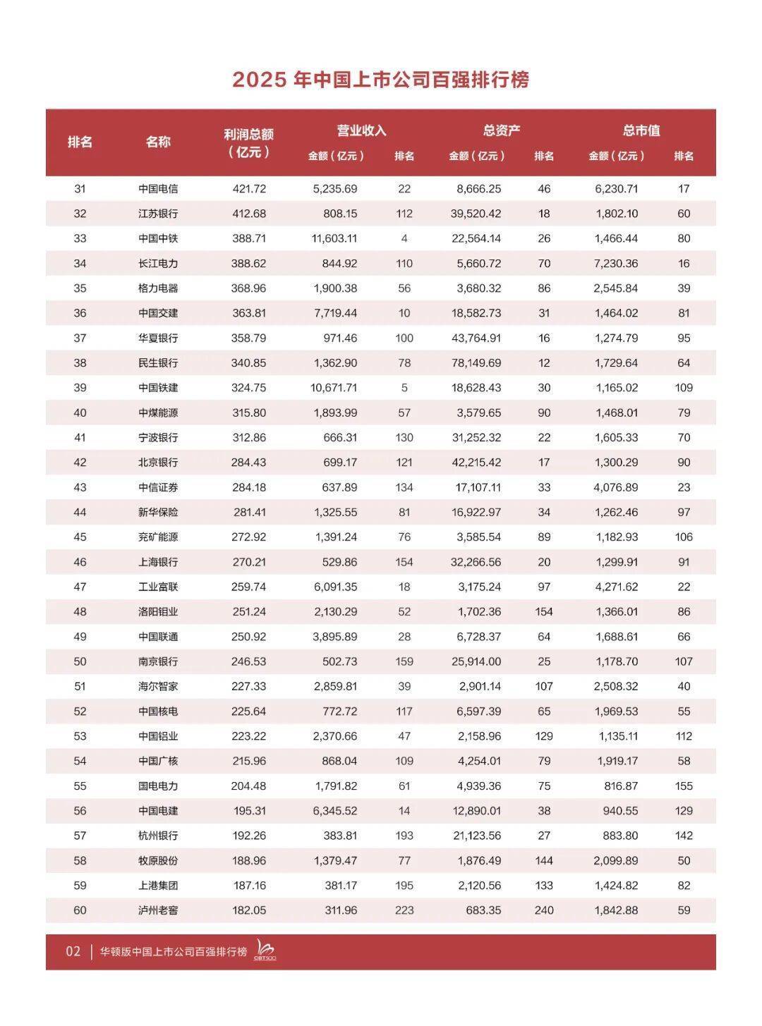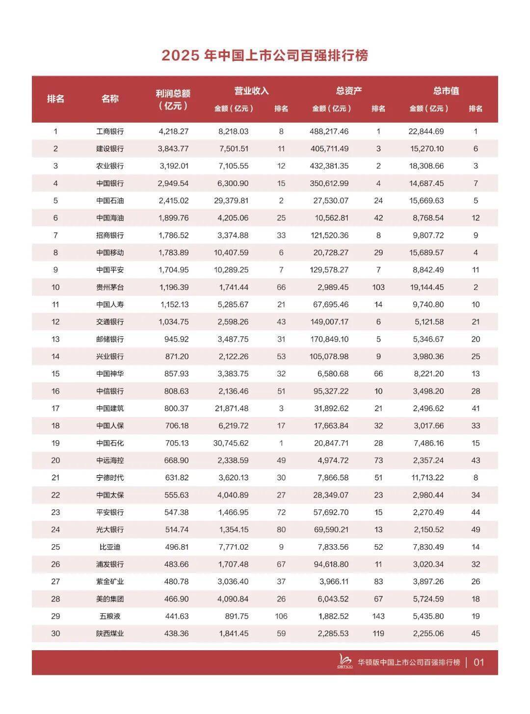 在“2025年中国上市公司百强排行榜”上,工商银行、建设银行、农业银行、中国银行、中国石油、中国海油、招商银行、中国移动、中国平安、贵州茅台稳居榜单前十。